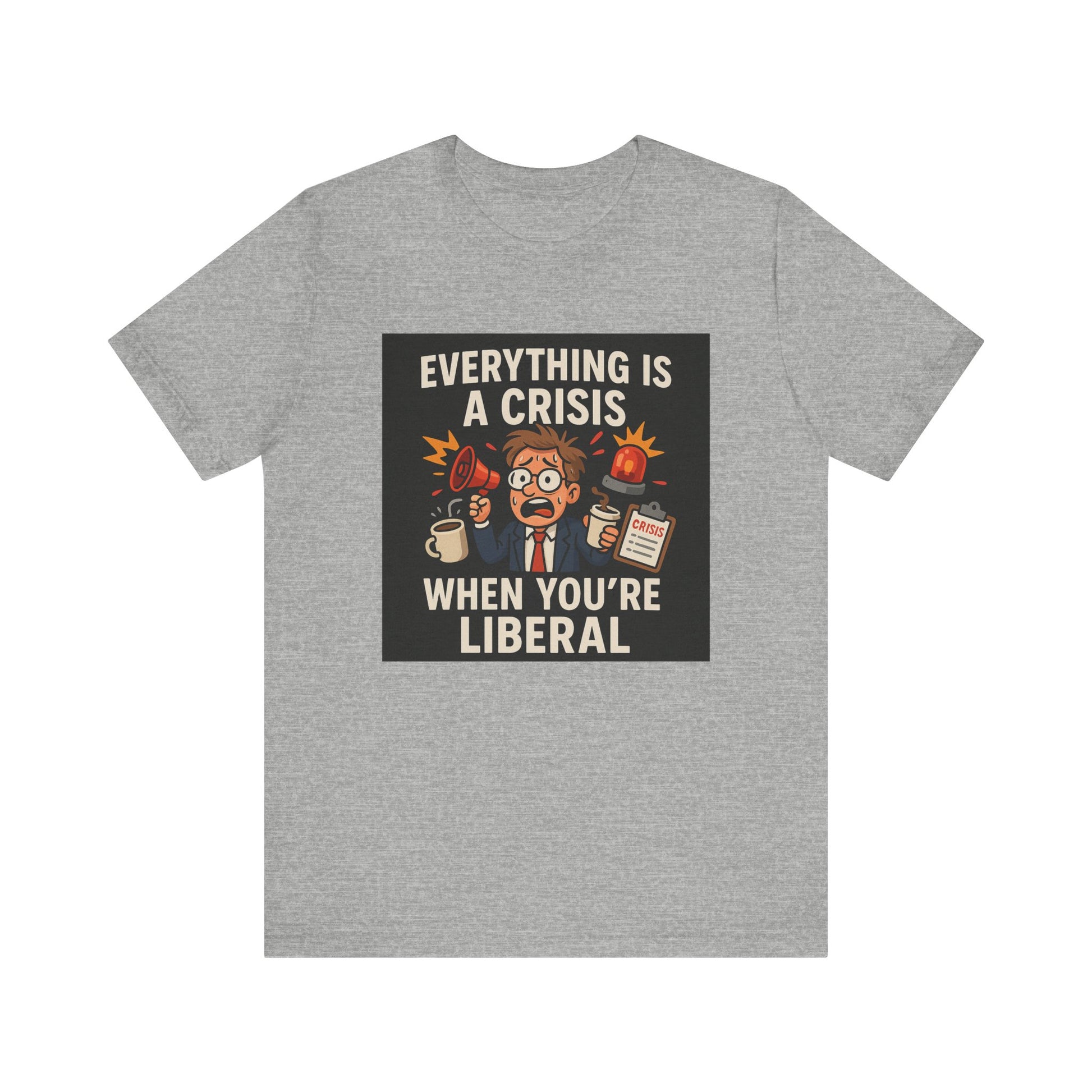 This graphic tee playfully pokes fun at constant crisis mode — alarms blaring, coffee sloshing, and panic buttons everywhere. Perfect for anyone who knows the internet outrage cycle a little too well.