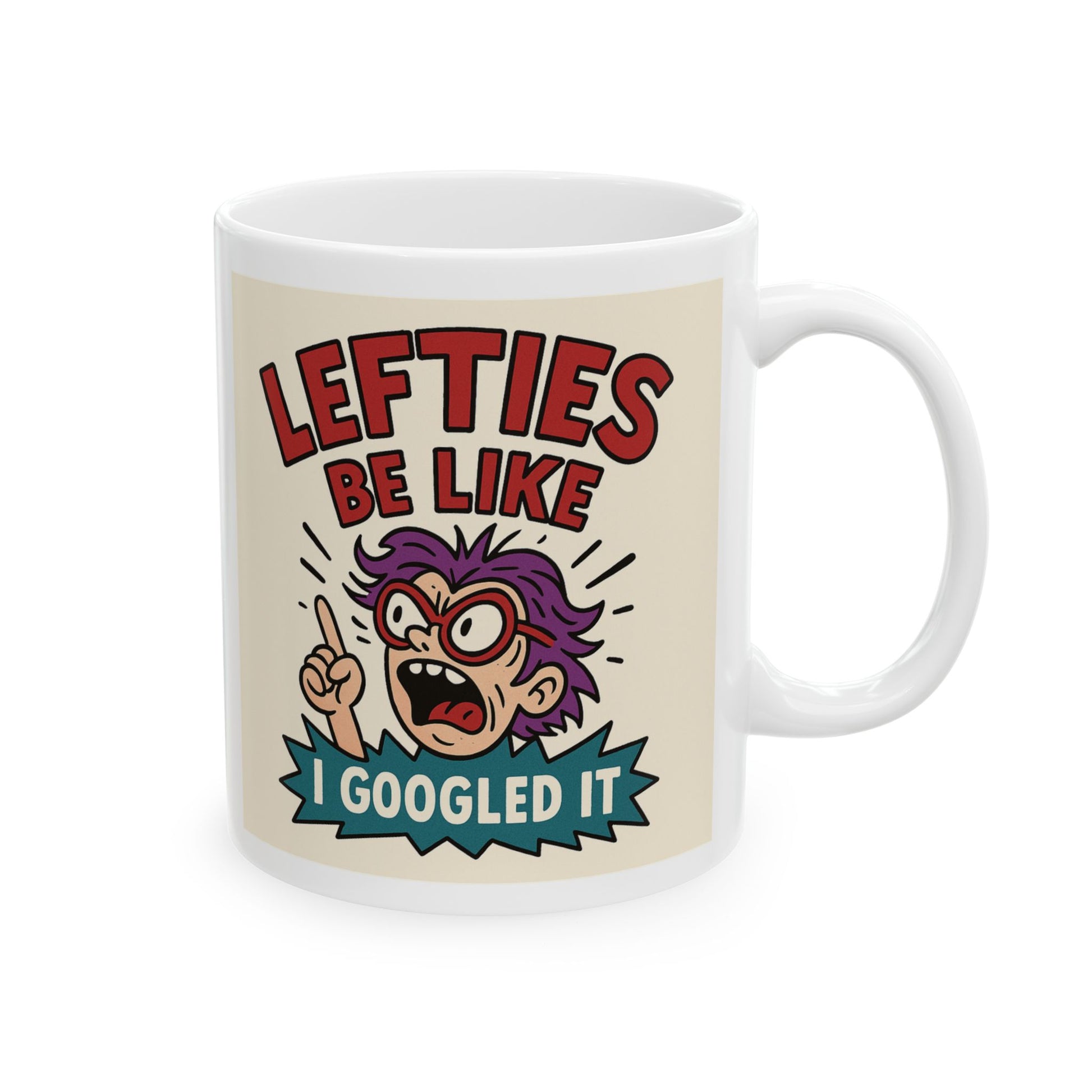 The “Lefties Be Like: I Googled It” mug is a hilarious political roast that pokes fun at knee-jerk internet experts. Bold colors, cartoon chaos, and perfect for coffee, tea, or fueling your next online argument.
